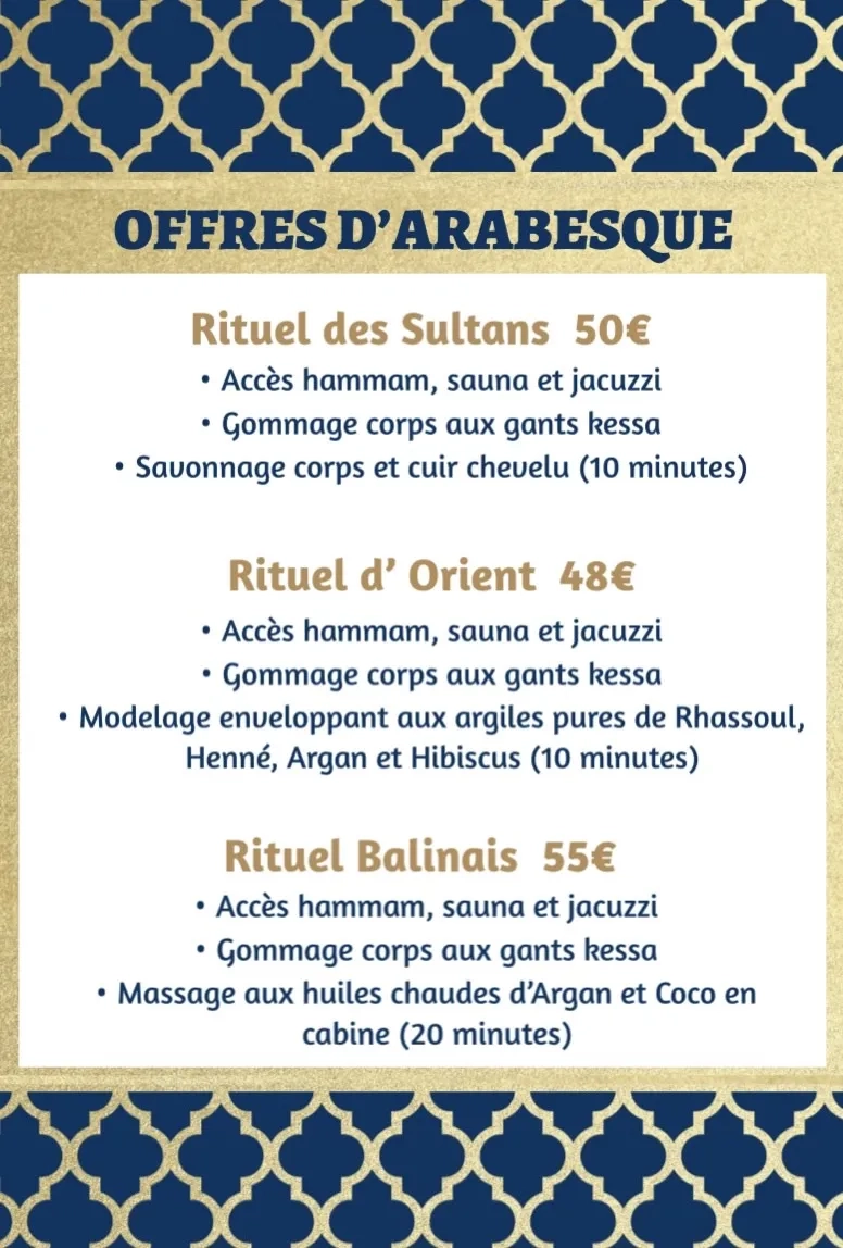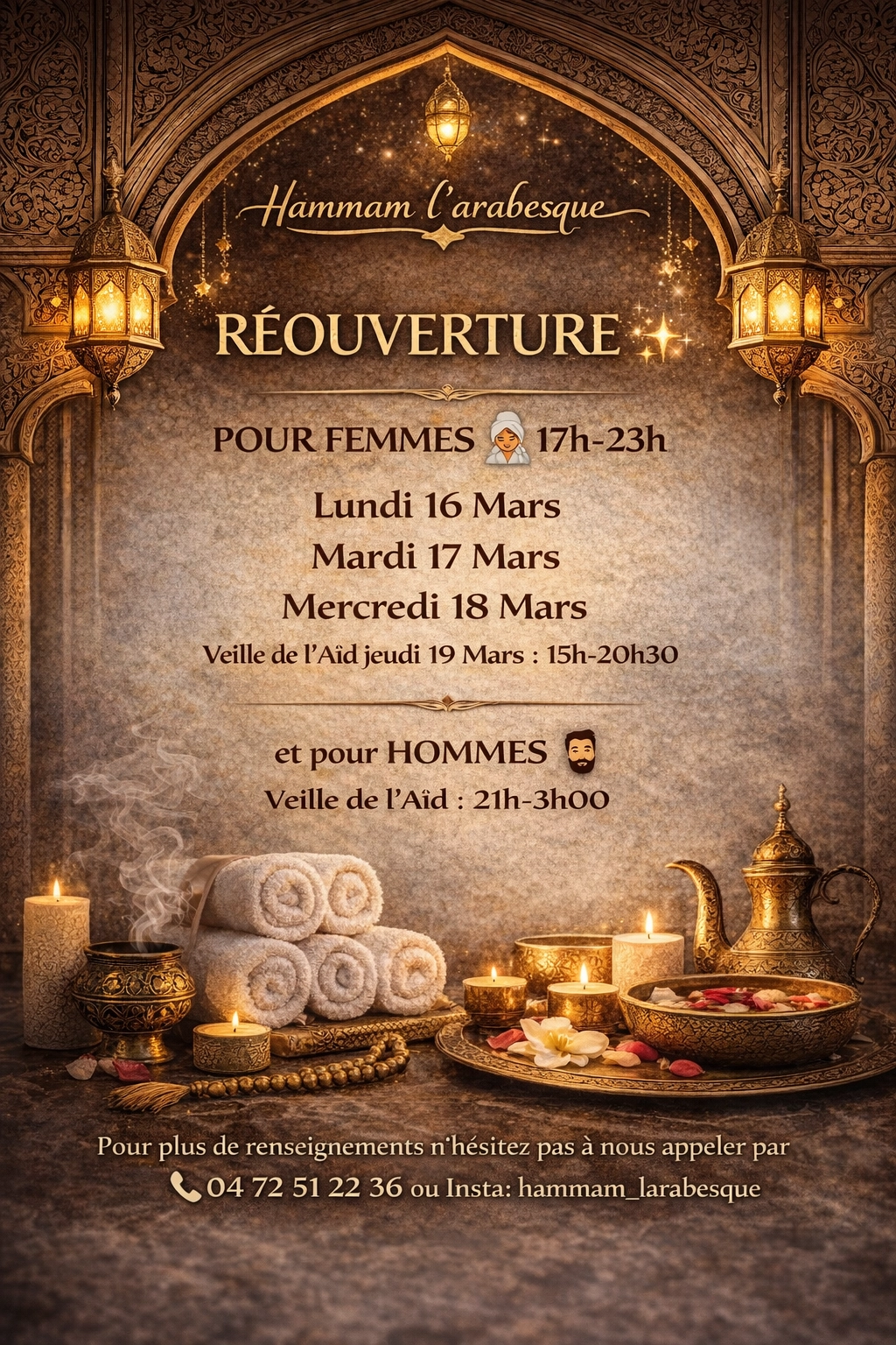 Le Hammam L'Arabesque situé dans le Rhône (69), dédié à offrir des expériences de relaxation et de bien-être inspirées des bains orientaux. Avec plus de 500m² d'espace de détente, notre établissement recrée l'ambiance authentique des hammams orientaux pour vous permettre de profiter pleinement des bienfaits de cette tradition ancestrale.